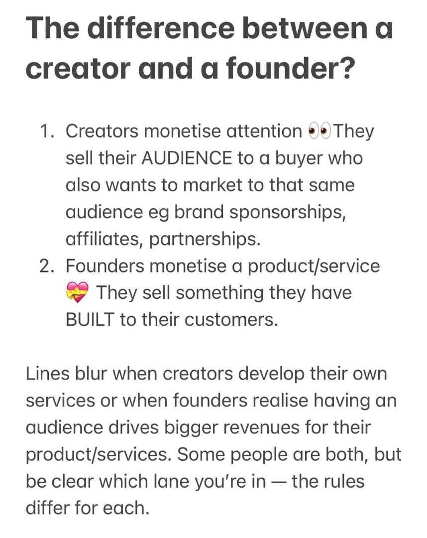 I’ve written this newsletter consistently for two years and spent over 1,000 hours on it but still doesn’t make me a penny. It costs me. But I have stuck with it because I am not a creator — I am an entrepreneur whose income comes from service including coaching and workshops. If I decided to monetise the newsletter (which is what Substack wants me to do) that would change the ‘business model of creatorship’' for me.