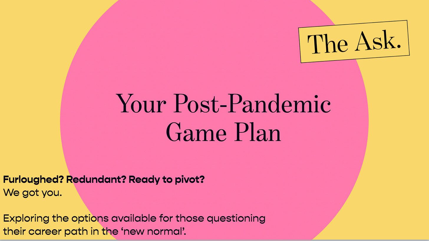 PS if you’re in need of a little career direction, a global pandemic has thrown a curveball in your path perhaps? You may want to join my (free) webinar next week. I’ll be giving out strategies for keeping your cool, finding hope in this difficult economic landscape, and coming up with some Plan Bs and Cs.