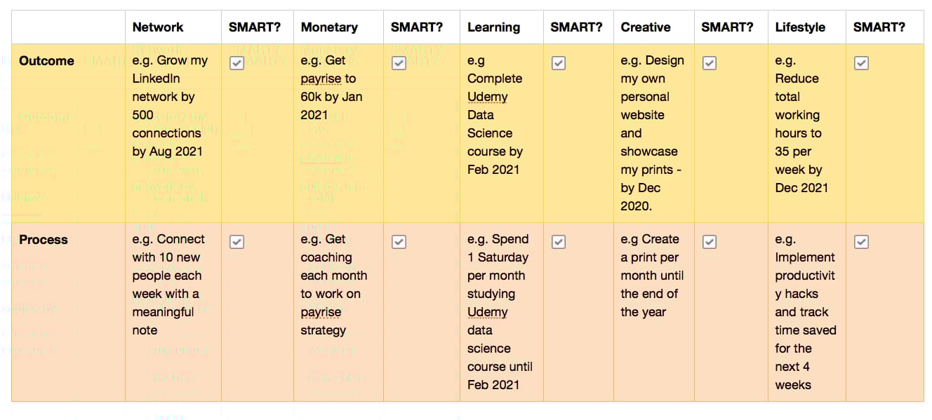 When you’re ready to put these goals onto a page and figure out if you’ve covered all bases you may want to use a table such as the below (I inputted some made-up goals).