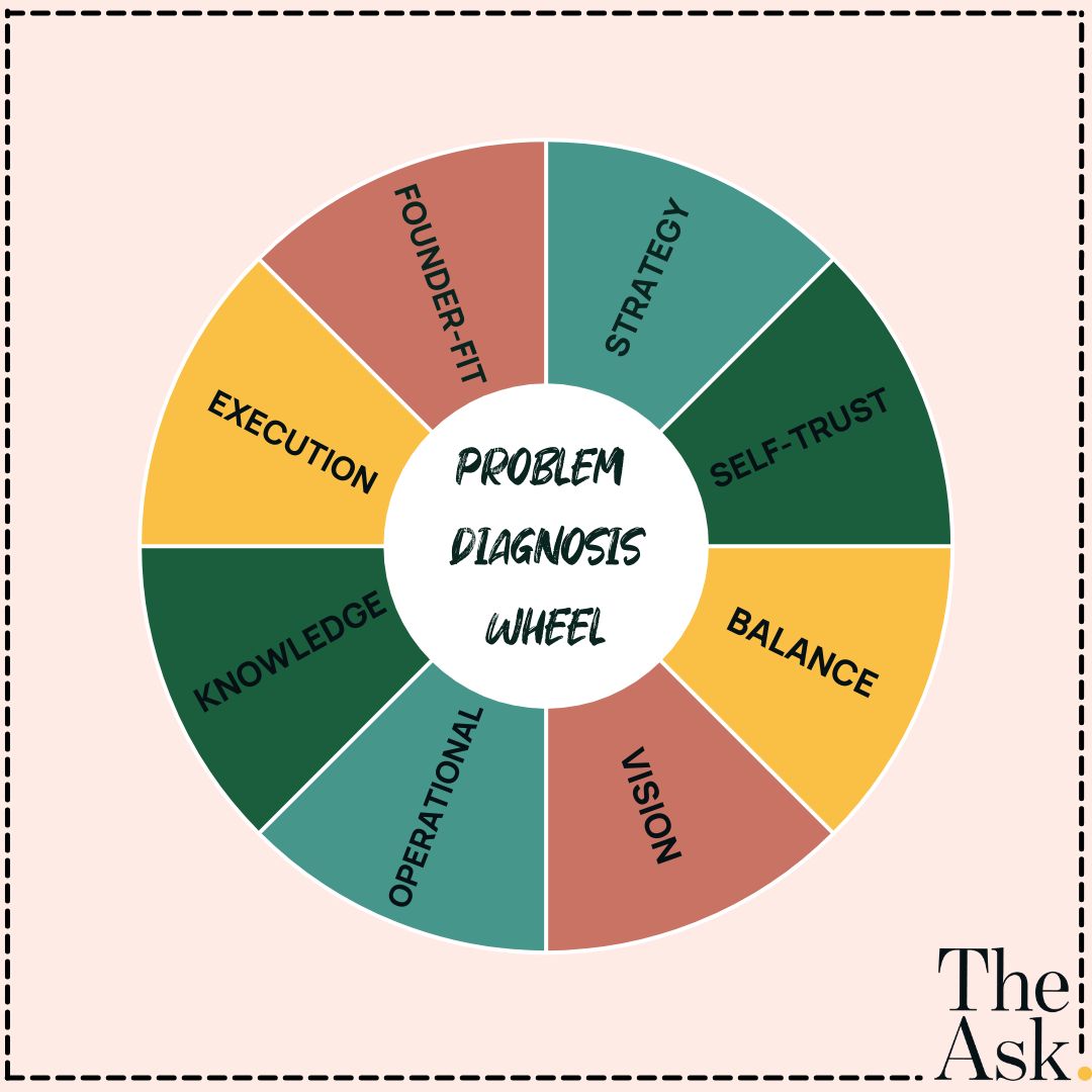 My coaching with The Ask both helps clients to figure out their problem(s) and supports them to create a bespoke plan for solving it. Personally, I’m strong at coaching the ‘top of the funnel questions’ of Founder-Fit, Vision, Self-Trust and Strategy, so that once these have been solved for, the rest can fall into place more easily.