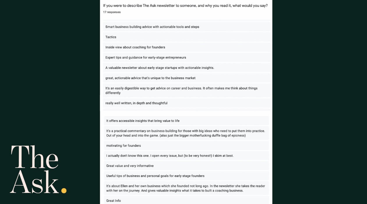 How? Press Share and write “I just read a really helpful deep-dive on how to get your first 1k email subscribers, by Ellen Donnelly from The Ask® — check it out and subscribe here!”