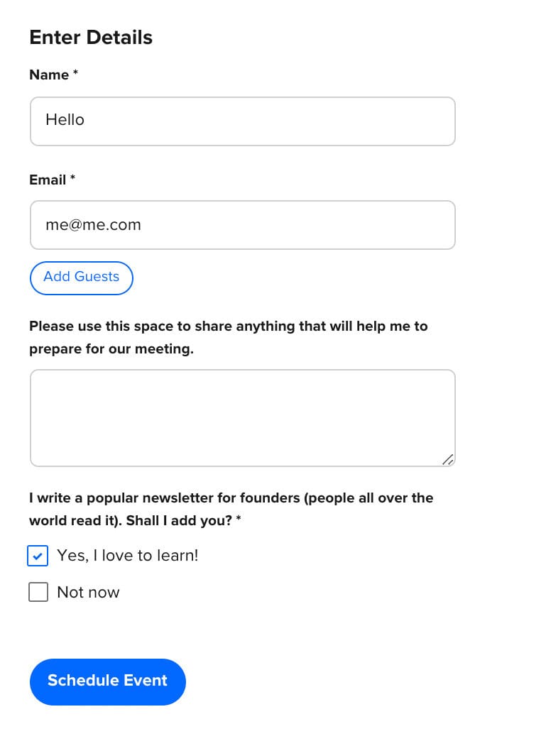 As a coach I meet a lot of new people, and Calendly prevents the headache of going back and forth to find a time to speak. During the scheduling process I’ve set up my Calendly with a newsletter opt in — see screenshot. Get a Calendly account today.