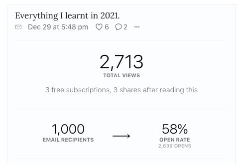 Building the relationship between you, the reader, and me, the writer.I believe by showing up consistently and sharing with you some of the more vulnerable parts of my experiences, you have got to know me somewhat. My top performing post below was one in which I talked about me and my business, rather than theory. I shared some highs and lows from 2021 in my business. As you can see I had exactly 1,000 subscribers, but this was viewed 2.7x as many times(!).