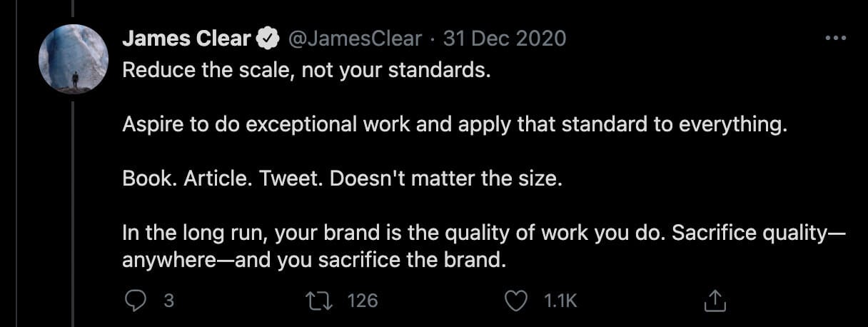 Make quality a priority. As this Tweet thread from James Clear on his 10th business anniversary suggests, reputation is everything.